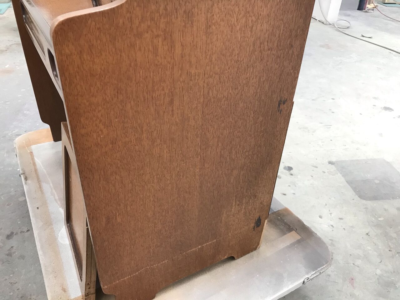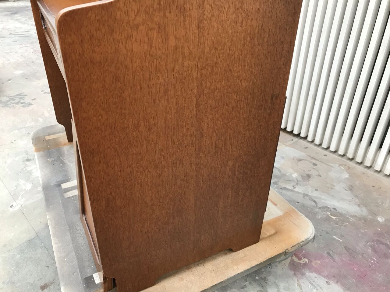 パテが乾燥後、再び鏡台全体をサンドペーパー(320番程度)で研磨をして表面を滑らかにして、上塗り塗料(2液型ウレタンクリヤー)を吹き付け塗装します。
