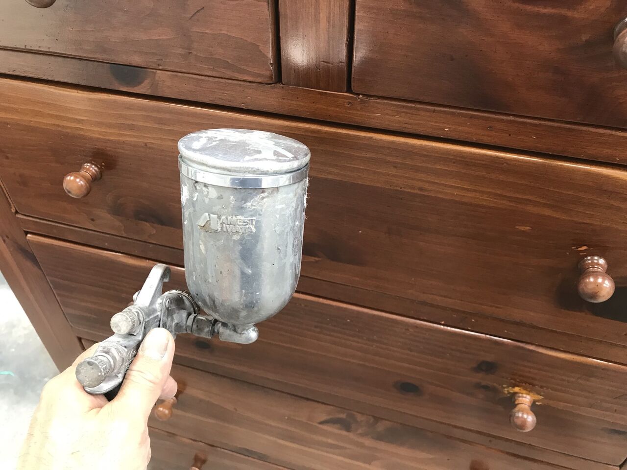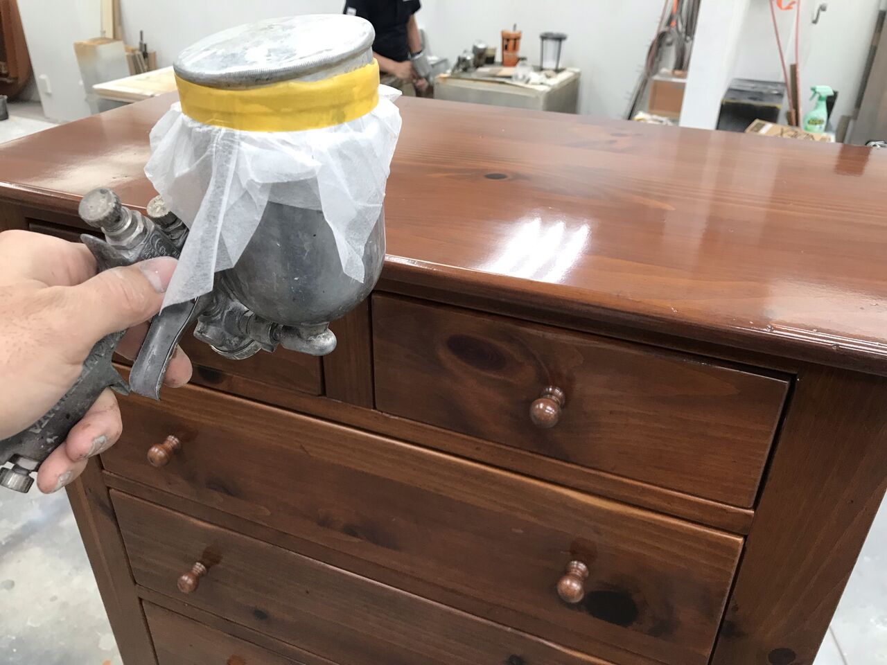 ある程度傷の補修が終わったら、家具全体をサンドペーパー(360番)で研磨し、下塗り(サンディングシーラー)を吹き付け塗装していきます。
