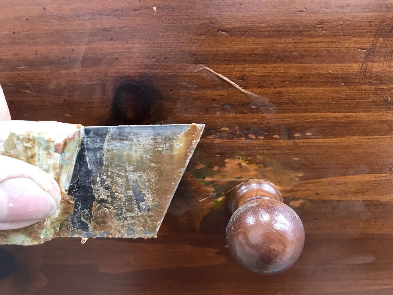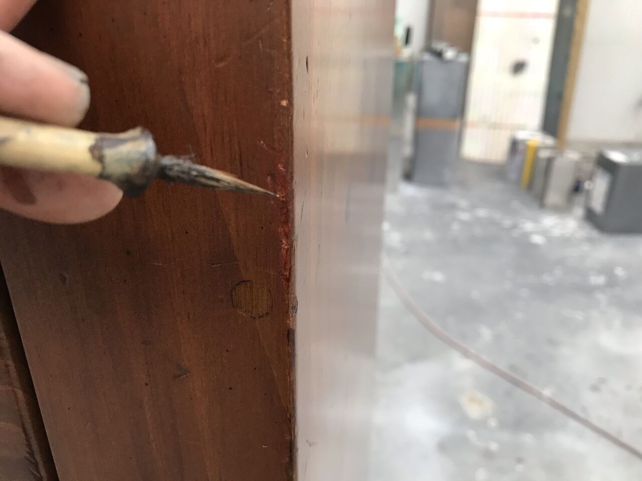引き出しの取っ手付近についた傷の凹みに、木地の色に似せて調色したパテを埋めて表面を平滑にしている様子です。