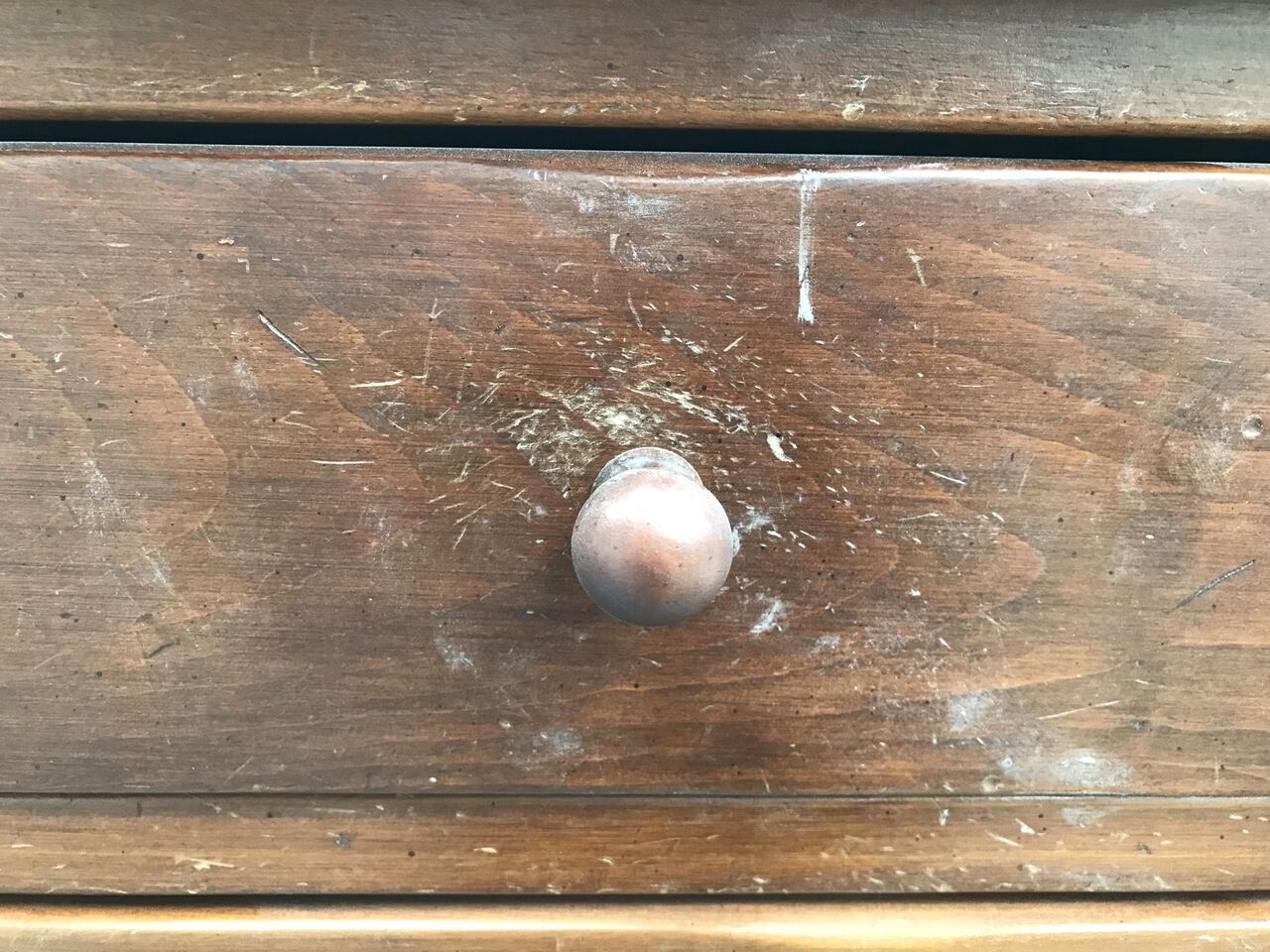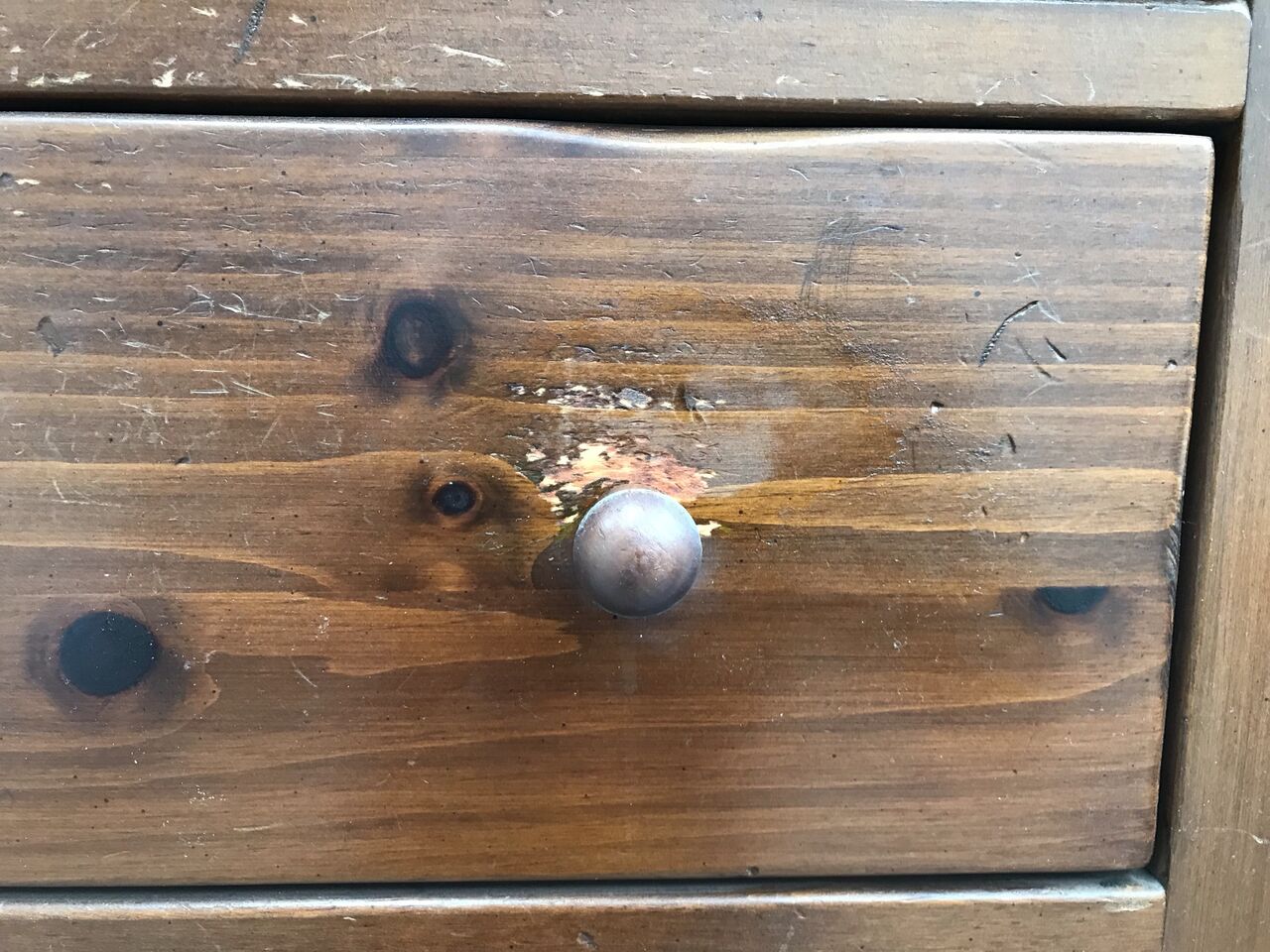 引き出しの取っ手付近に、あからさまに後から付いた傷がありますね。