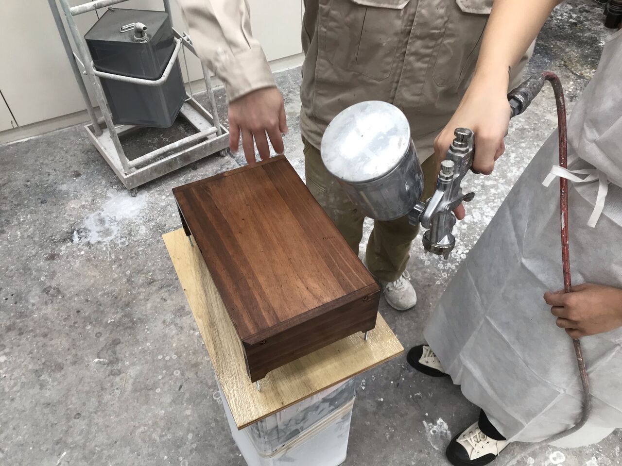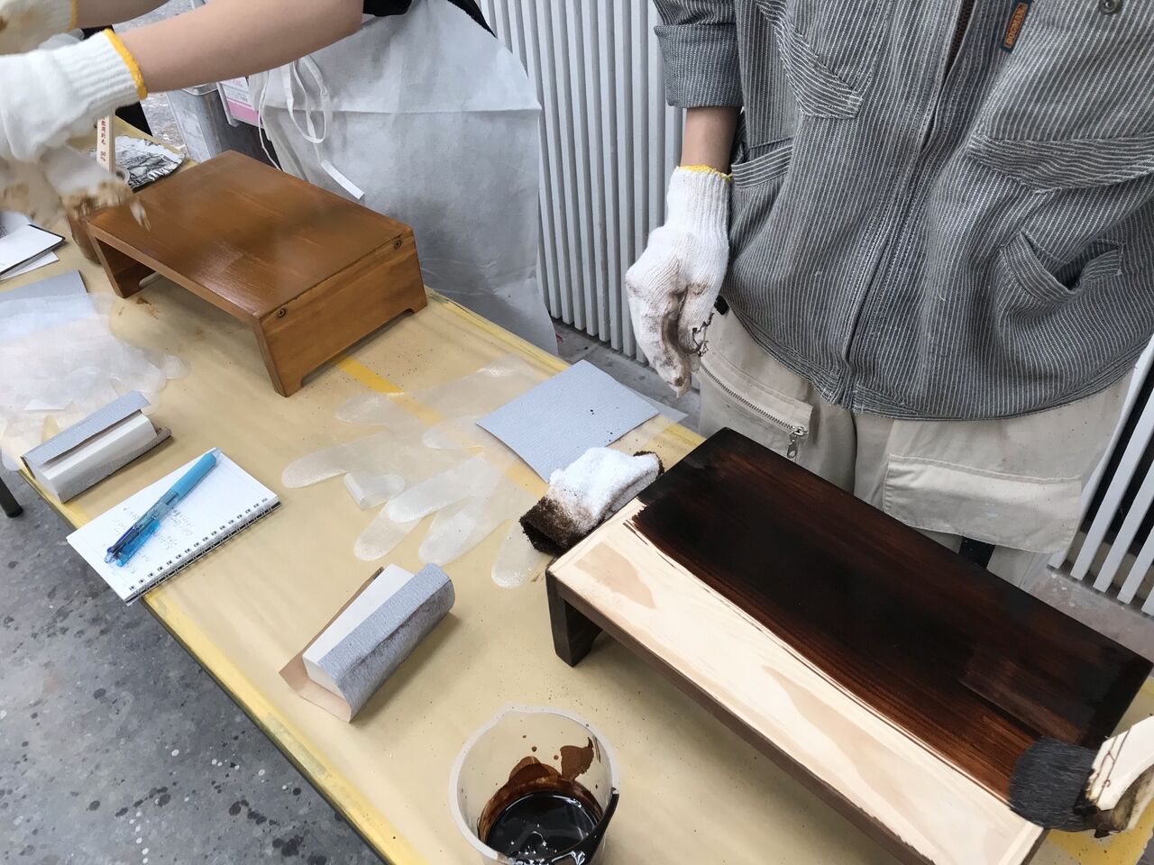 皆さんは本格的な木工塗装(2液型ポリウレタン塗装)は初めての体験のようでしたので、工程ごとにやり方をレクチャーさせて頂きながら、一緒に作業を進めていきました。