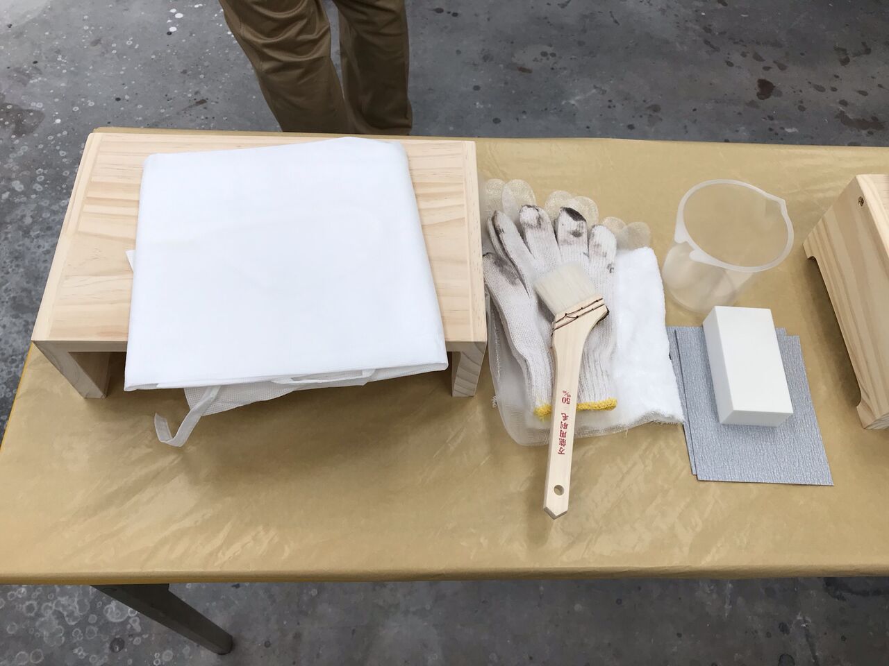 その木製品と木工塗装に必要な道具類(木工塗装体験セット)を各々にお配りしました。
