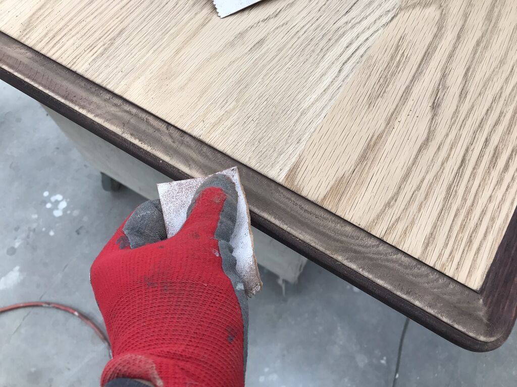 サンドペーパーを当てすぎて、木地着色が取れないように注意します。
