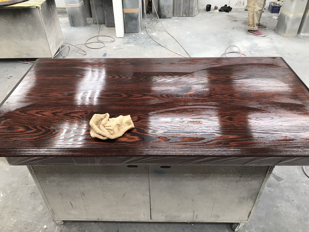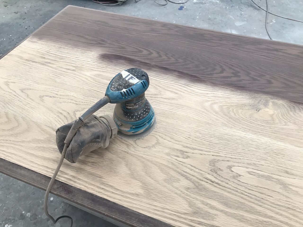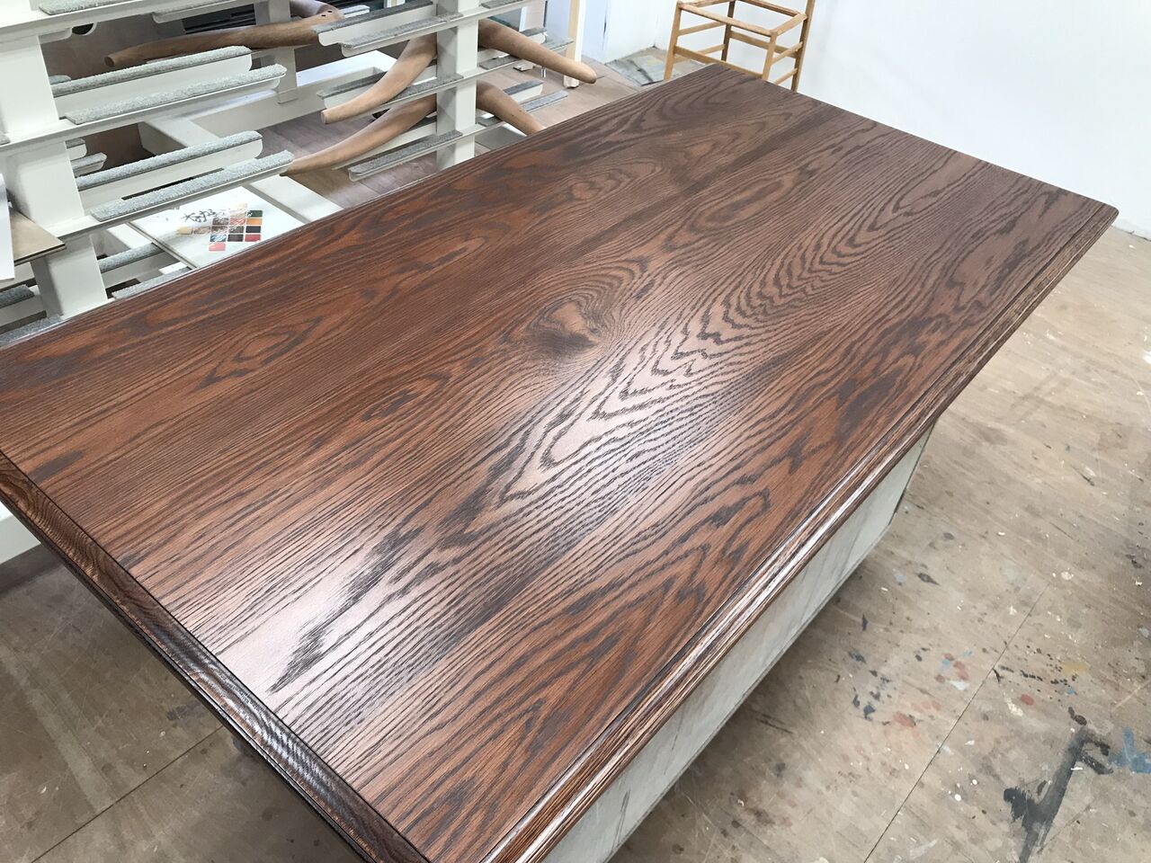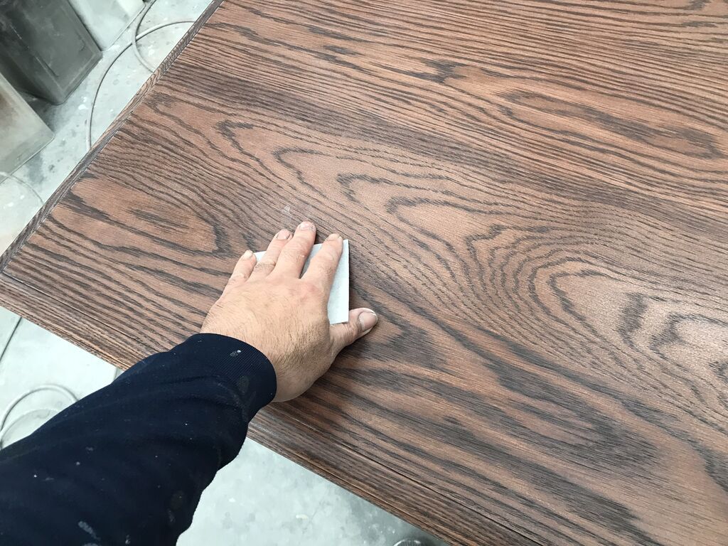 今回は天板のみをお預かりしたので、脚部との違和感がないよう、現状の色合いや雰囲気に近づけるように作業を行います