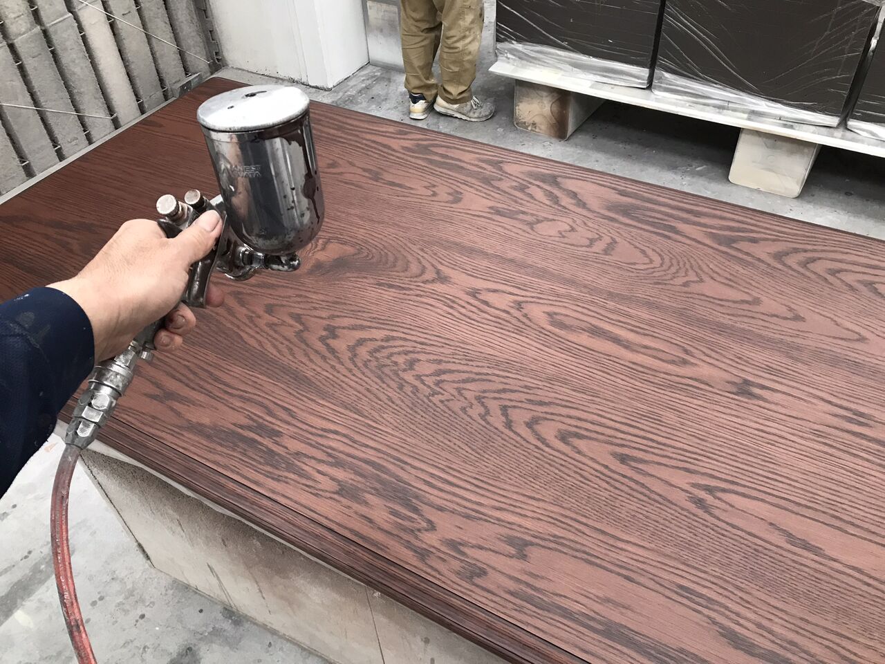 カラーリング工程では、調色した染料系の着色剤を表面に吹き付けて、色を濃くしていきます。