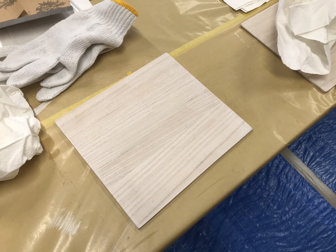 刷毛で着色剤を塗ったら、乾いてしまう前に余分な着色剤をウエスで拭き取ります。