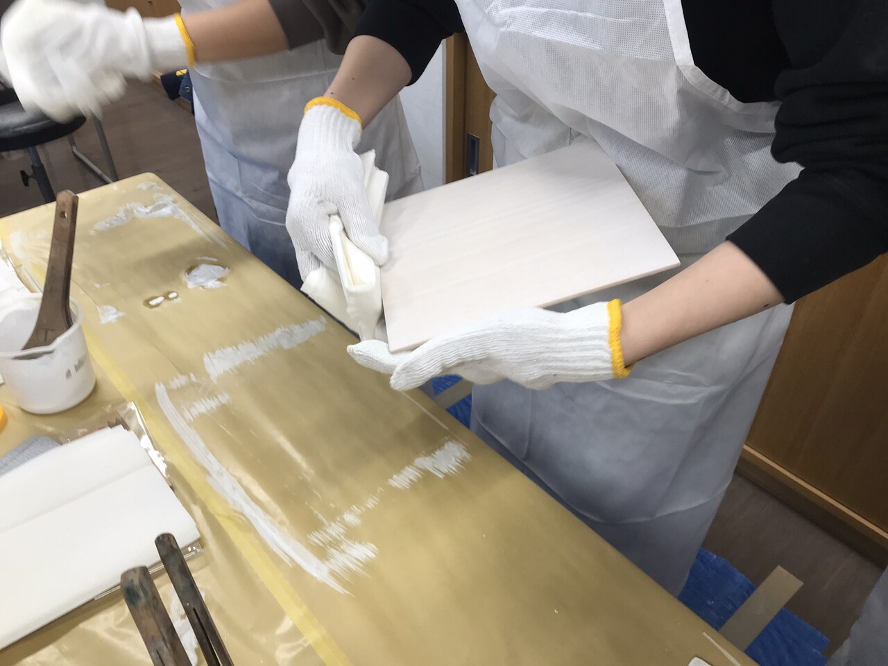 先ずは塗料で服が汚れないように、皆様には紙エプロンを着けてもらいます。
