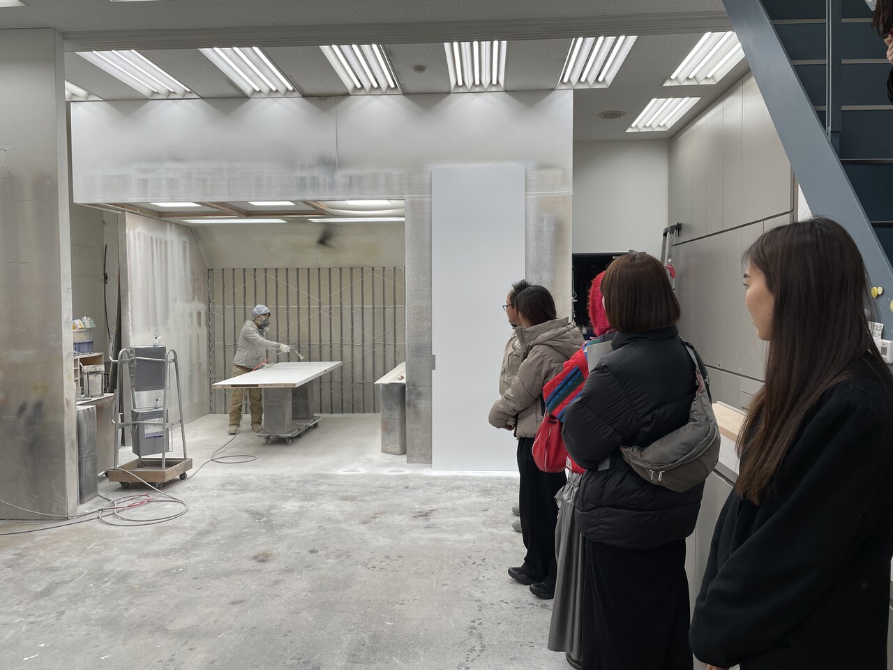塗装スタジオ2階の作業場では、塗りつぶしの建具を仕上げている様子を見学。