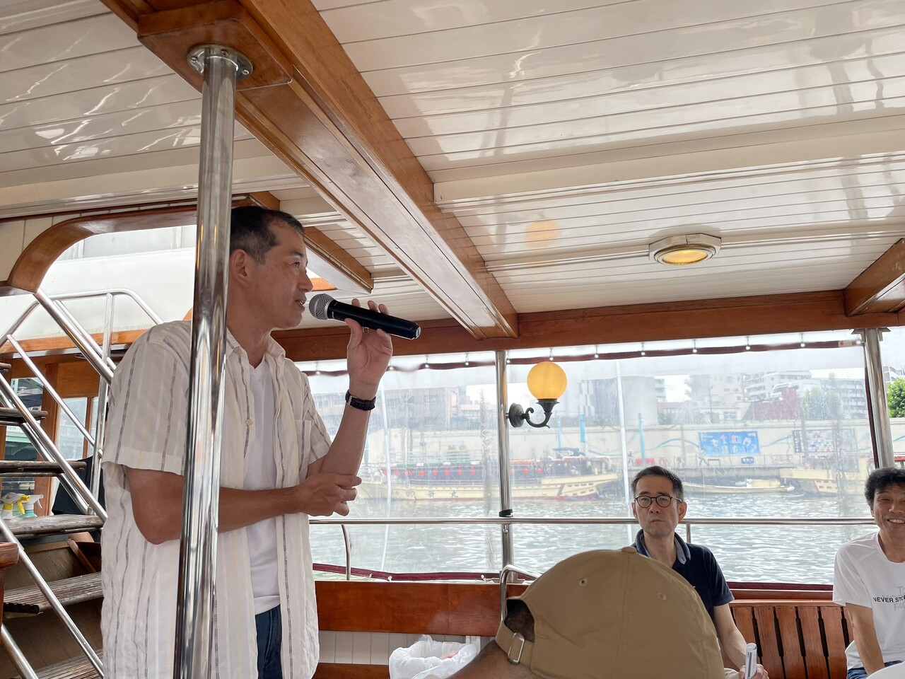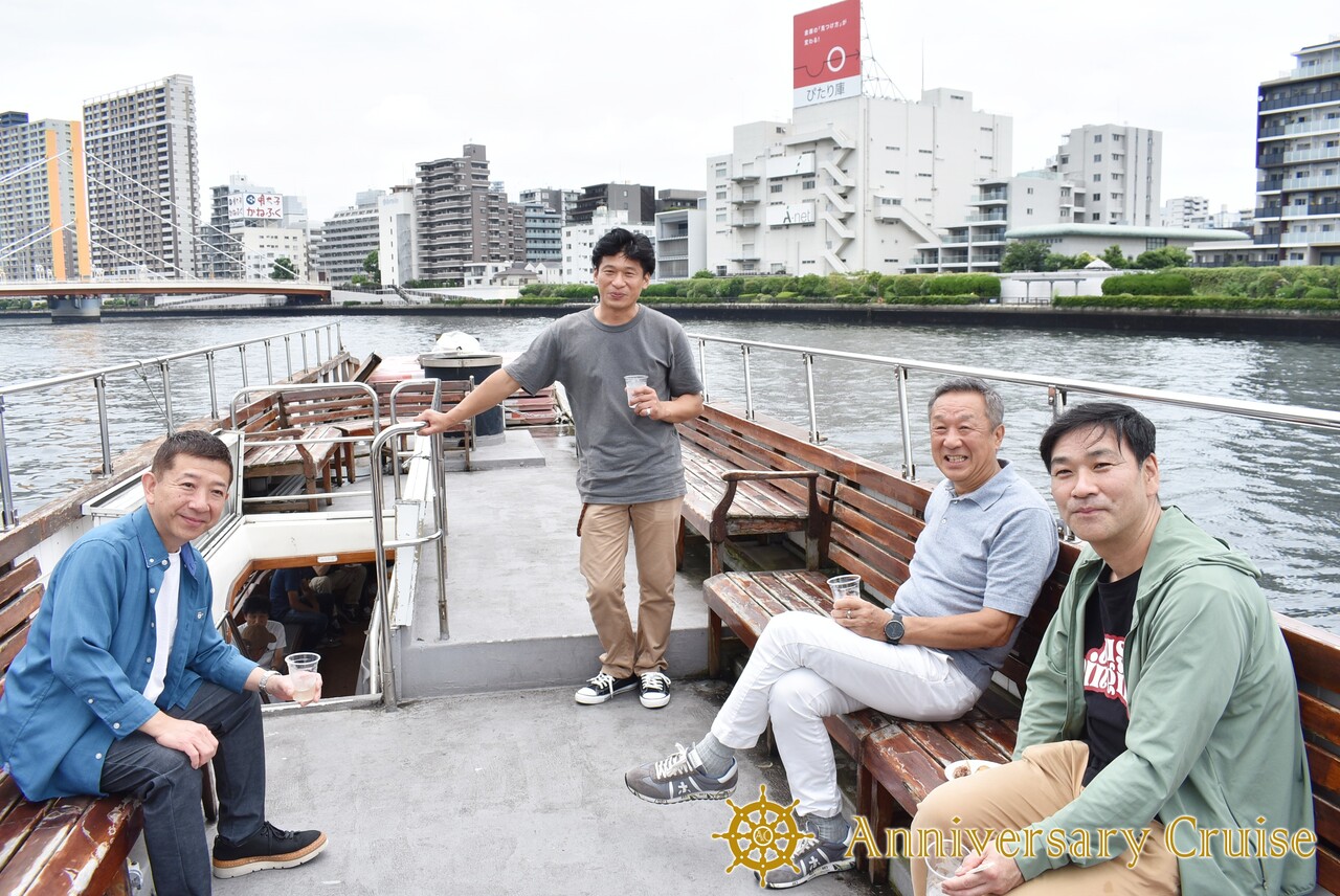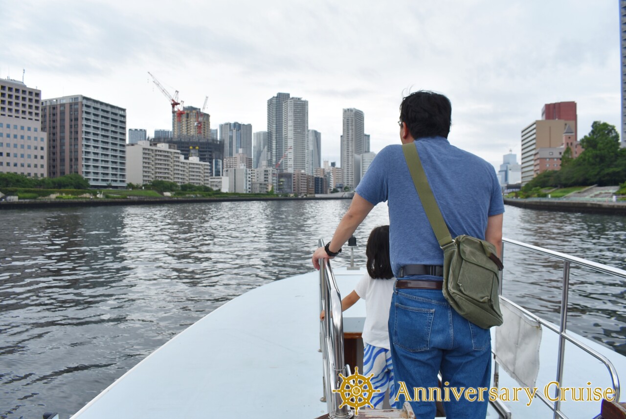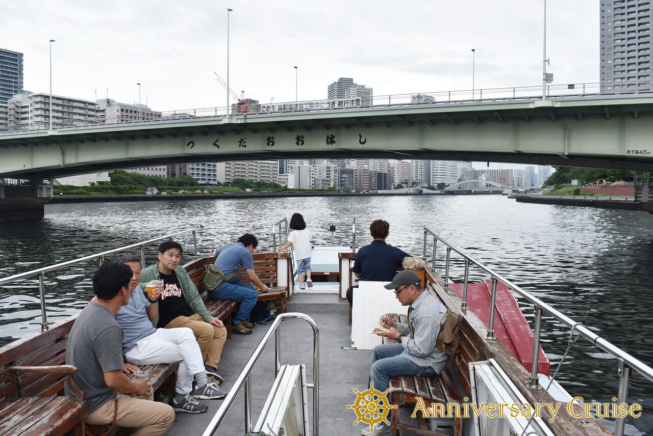 隅田川から眺める東京の街並みをつまみに談笑など。