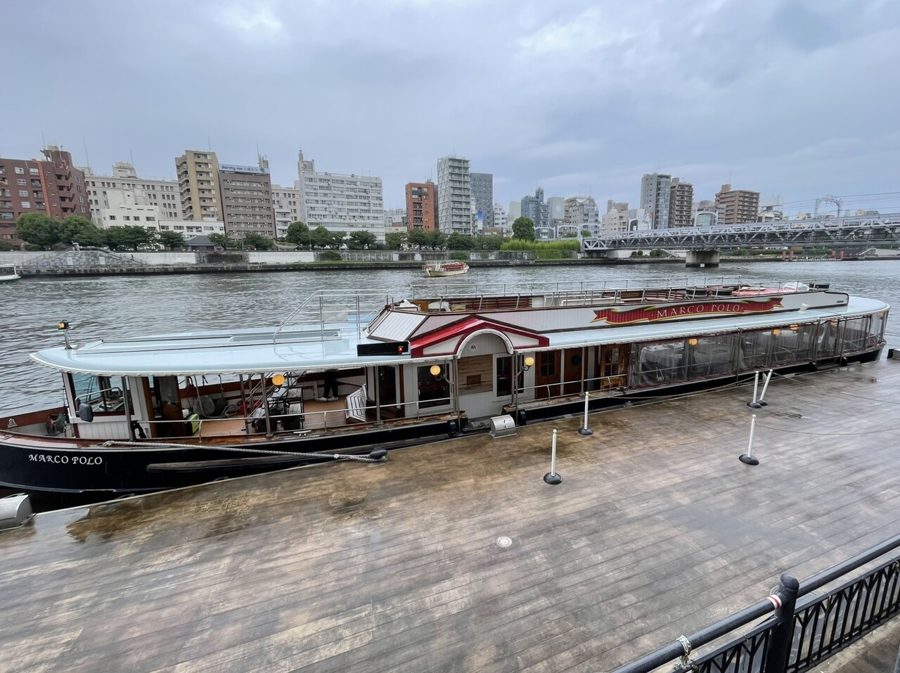 吾妻橋桟橋に同社クルーズ船のMARCO POLO号がお出迎え。