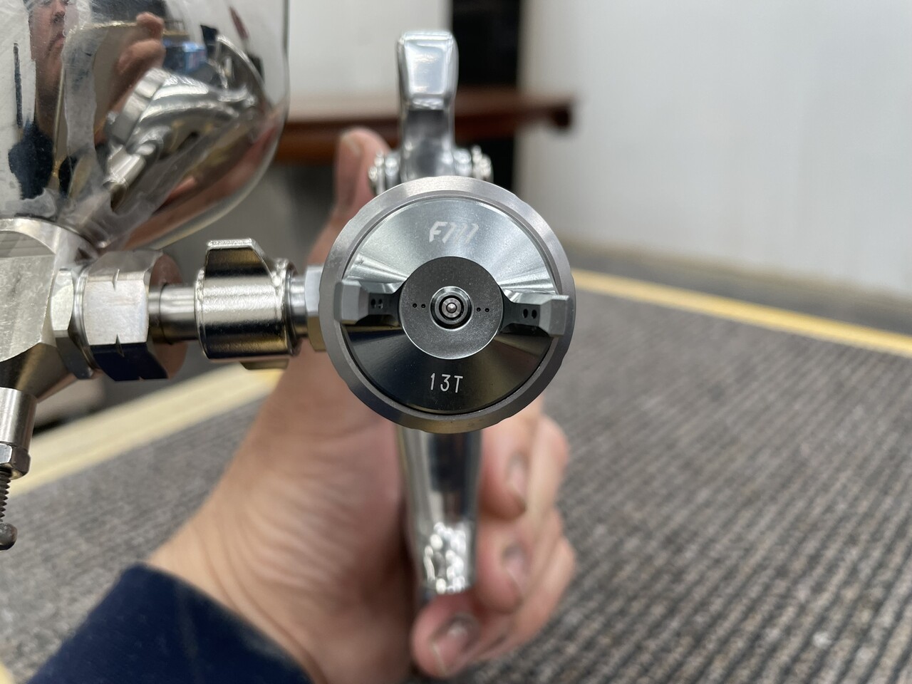 作業性を重視した「ストレートパターン」のスプレーガンは、シビアに塗肌の良さを求めない下塗りや中塗りの際に使用し、高微粒子化の「チューリップパターン」は、被塗装物へ均一に塗料を乗せる必要のある、シビアなメタリック塗装やパール塗装などに使用するとさらに作業性が向上するのでしょう。
