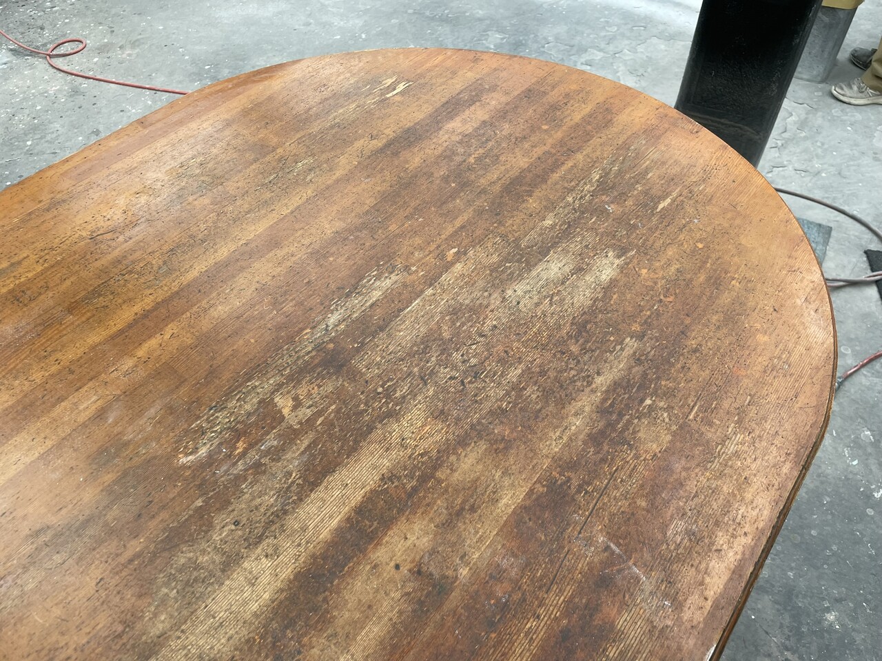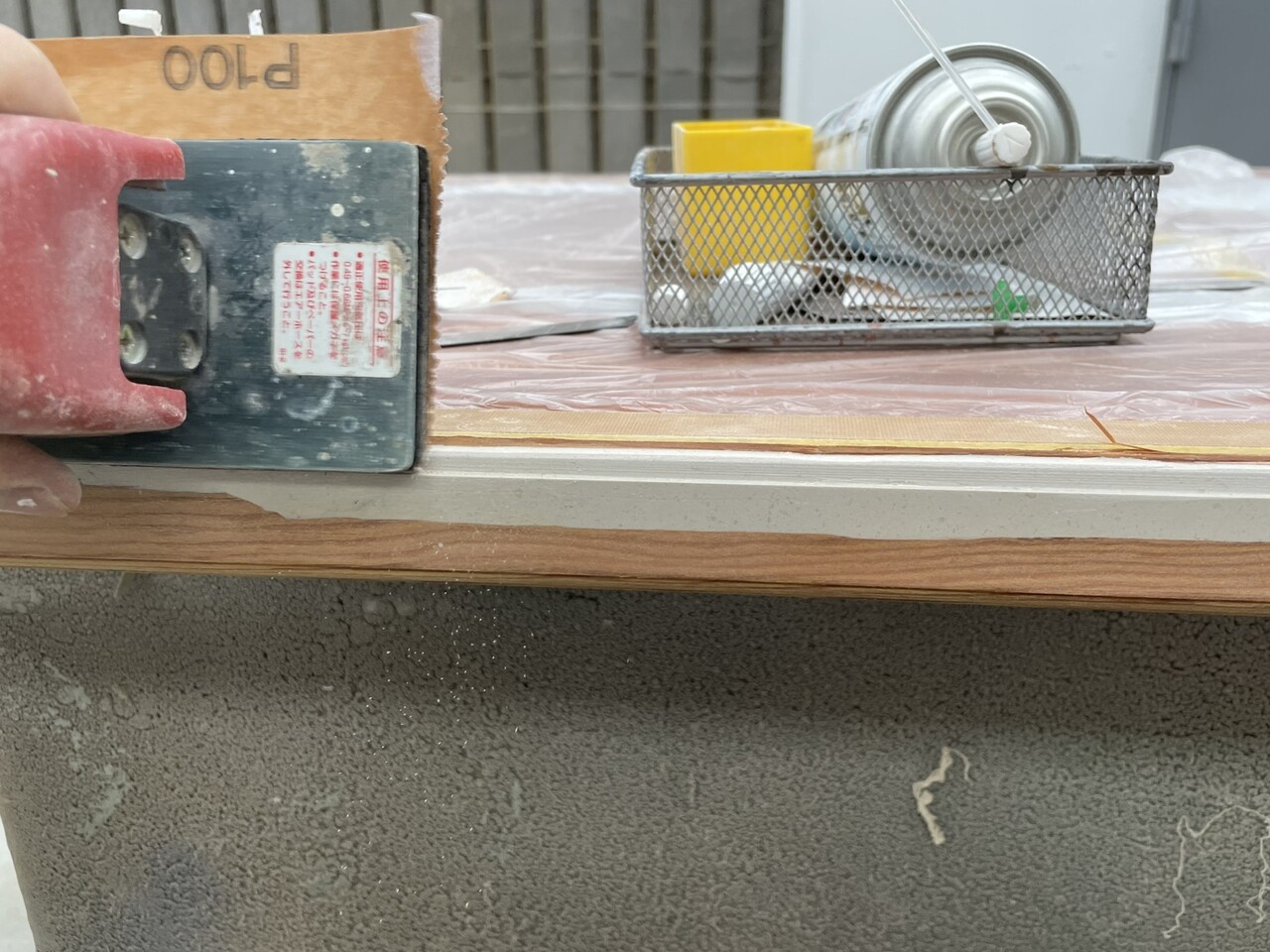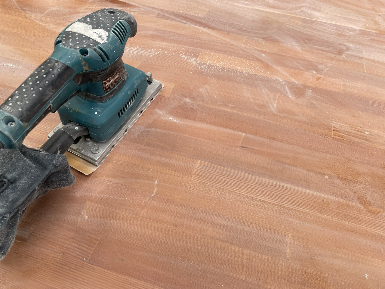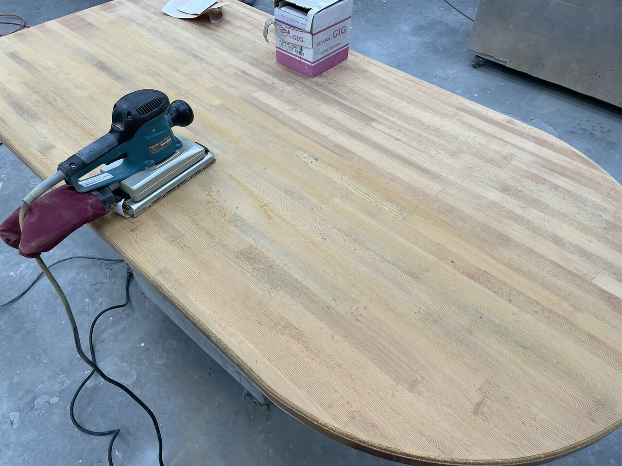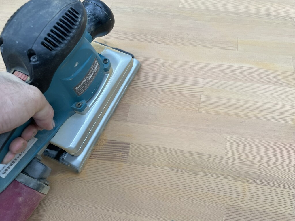 さらに、表面の染みこんだ汚れが取れるまで、木地にサンダー掛けをして削っていきます。