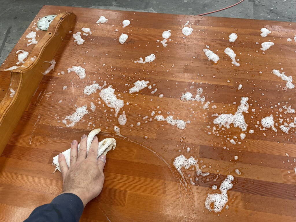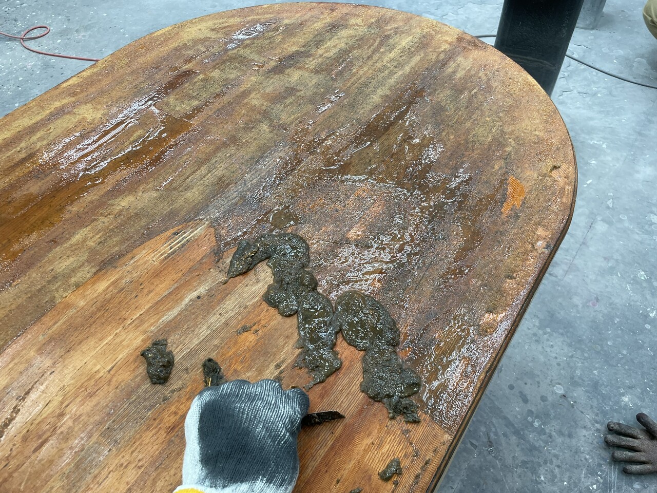 薬品(剥離剤)を塗布し、傷んだ塗装を溶かして除去していきます。
